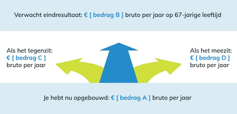 Het bedrag bij de bovenste pijl in het midden (bedrag B) is het verwachte eindresultaat. In de praktijk zal je pensioen ergens tussen de bedragen aan de linker- en de rechterkant uitkomen. Wat je pensioen uiteindelijk wordt, hangt af van hoe de economie zich ontwikkelt. Gaat het heel slecht met de economie of stijgen de prijzen juist fors? Dan kan je pensioen uitkomen op het linker bedrag (Bedrag C). En als het juist beter gaat met de economie, dan kan je pensioen uitkomen op het rechter bedrag (Bedrag D). Er is een hele kleine kans dat je pensioen nog iets lager of hoger uitkomt dan de bedragen die je hier ziet.